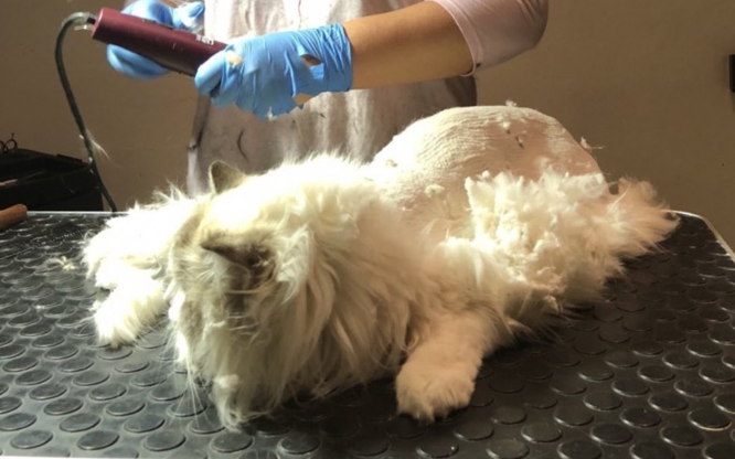 Lejon klippning. Vi problem med tovor är detta metod ett måste. Klipper hela pälsen jättekort, spårar på svansen, benen och huvud som kommer formas fin. Håret växer på nytt ca 2 månader efter 6 månader är jättebra om du ska upprepa.
