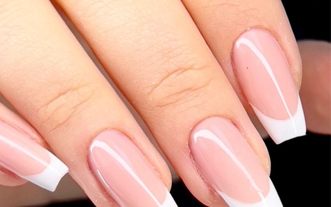 Nagelförlängning med klassist fransk manikyr eller fransk ombre.