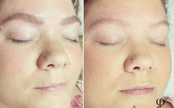 Bruna skorpor visas och förblir synliga i ca 4-7 dagar. Dessa ska man inte pilla på utan låta läka ifred. Man kan ha en rodnad i det behandlade området i upp till 2 månader efter avslutad behandling, beroende på känslighet i huden. Man bör inte utsätta huden för direkt solljus kommande 2 månader efter behandling pg.a att man kan dra åt sig pigment och det kan skapa mörka fläckar, såkallad hyperpigmentering. Man kan tex skydda med solglasögon eller kläder. Och sedan fortsatt skydda med Solfaktor 50 efter behandling.