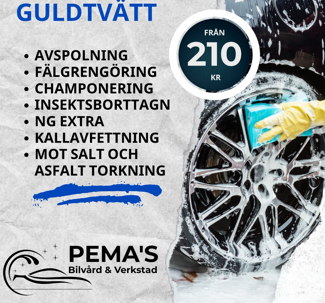 Vår Extra Supertvätt erbjuder en komplett service med utvändig avspolning, schamponering och fälgrengöring, kombinerat med invändig dammsugning, spolning av mattor, panelrengöring och fönsterputs. Vi tar bort insekter, motverkar salt och asfalt med extra kallavfettning, och avslutar med torkning samt rengöring av dörrgångar. Perfekt för en bil som ska kännas som ny! (Ca 60-90 min)