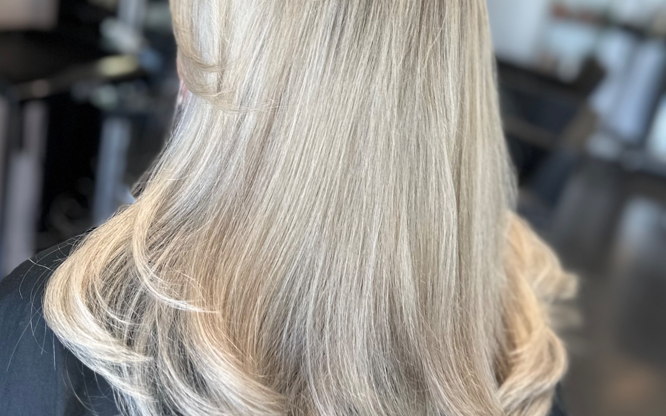 Balayage långt hår (nedanför axlarna), tvätt och fön ingår. Extra tjockt hår kan påverka tid och pris.